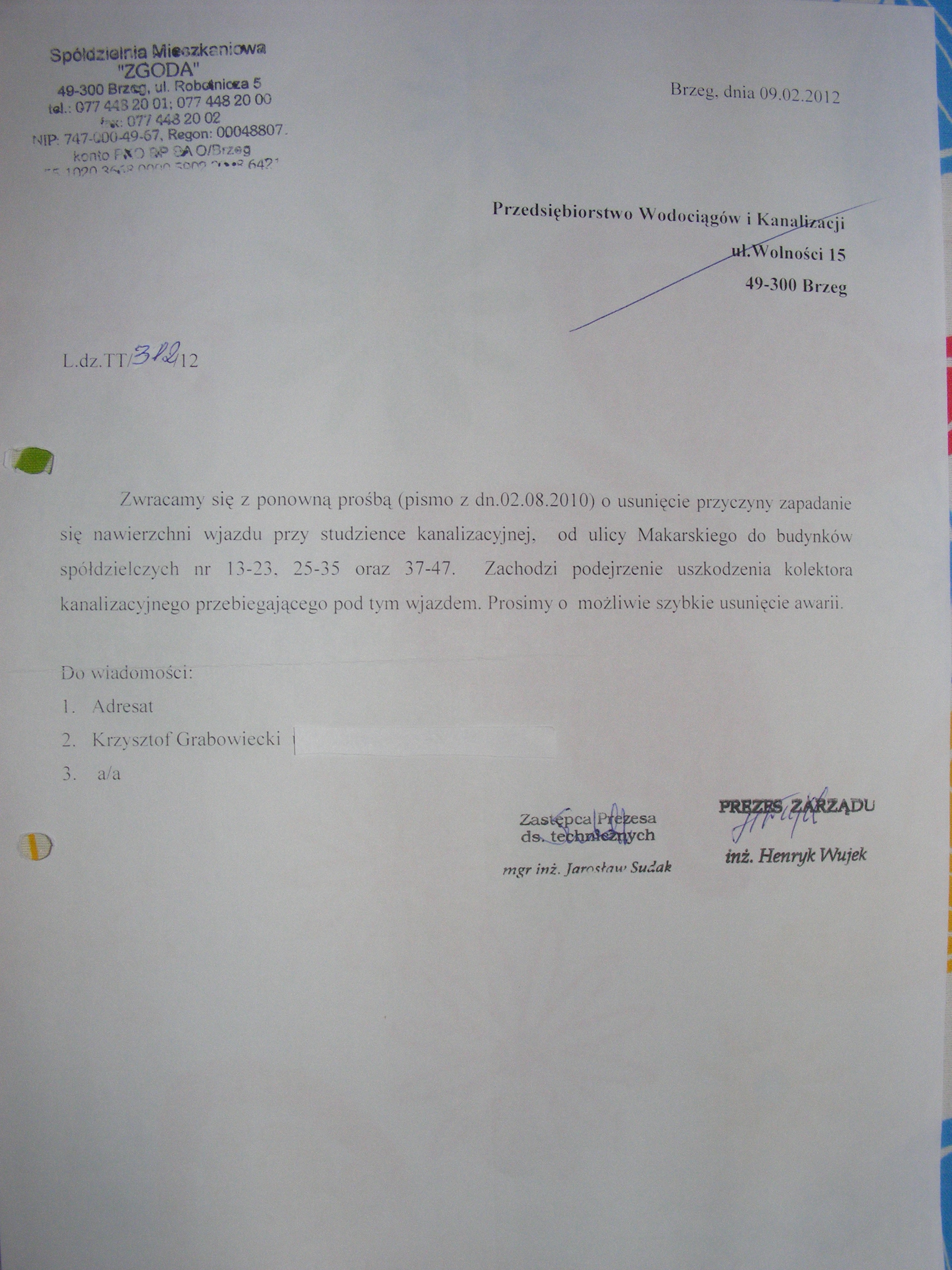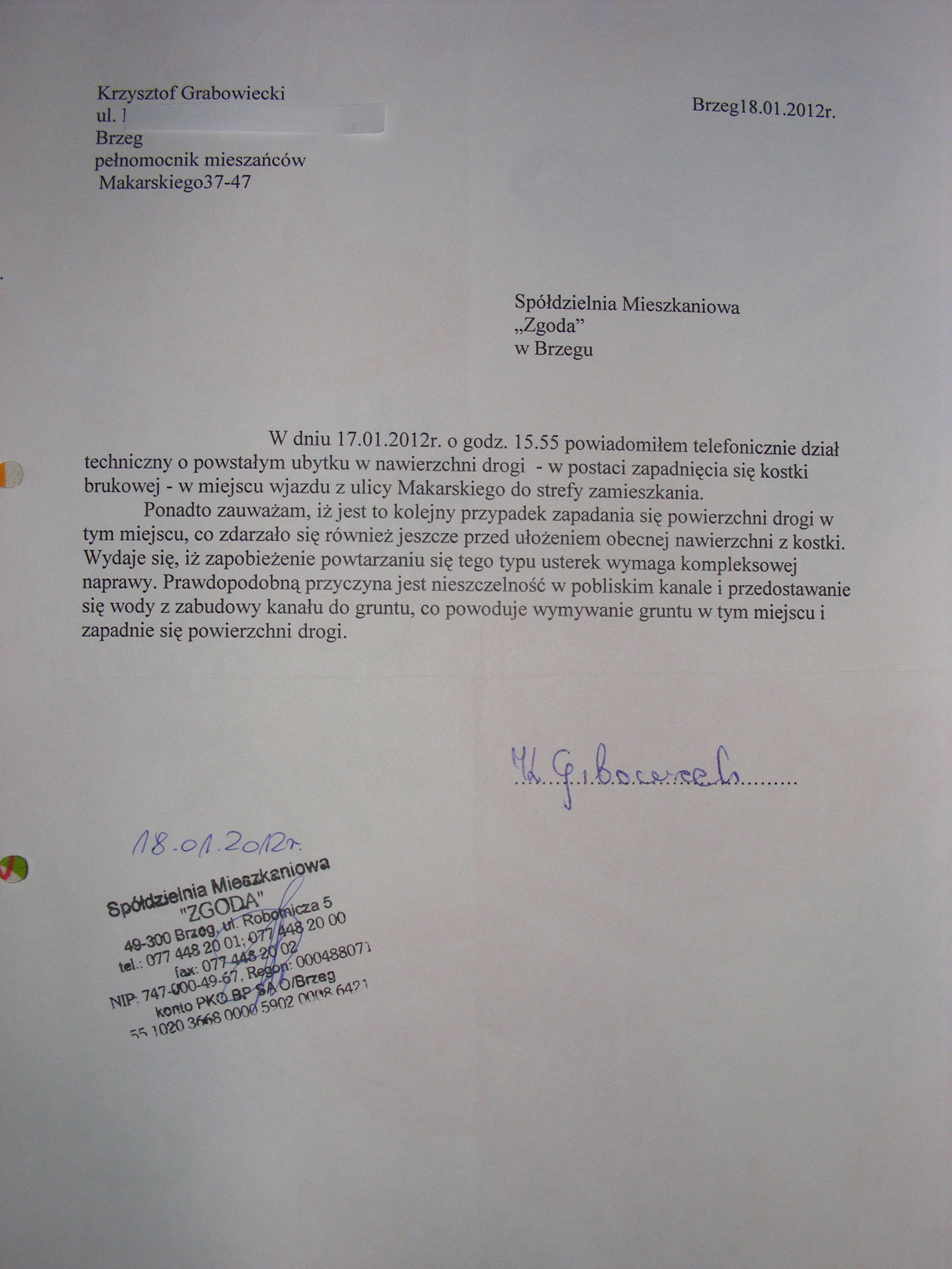 W związku z postawionym mi - jako członkowi Rady Nadzorczej i jednocześnie kandydatowi do tej rady- pytaniem przez Pana Pawła Kozika na Walnym Zgromadzeniu w dniu 20 maja 2015 roku - co zrobiłem w sprawie "wielkiej dziury" jaka jest przy wjeździe na drogę osiedlową z ul. Makarskiego, poniżej zamieściłem pismo, jakie skierowałem w dniu 18 stycznia 2012 roku do Zarządu spółdzielni oraz uzyskaną w tym zakresie odpowiedź- pismo z dnia 09.02.2012r. Pan Paweł Kozik zadał mi powyższe pytanie co jako członek rady zrobiłem w tym zakresie. Nadmieniam, iż interweniowałem w tej sprawie w styczniu 2012 roku jako pełnomocnik nieruchomości i nie byłem wówczas członkiem Rady Nadzorczej. Członkiem Rady od 1 stycznia 2012 roku był właśnie Pan Paweł Kozik. Czy w okresie zasiadania w radzie tj. do dnia 16 maja 2013 roku interweniował w tej sprawie?